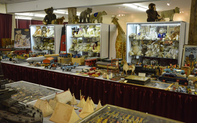 Cases filled with the Steiff collection.
