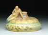 DELATTE CAMEO BOX. Beautiful Delatte powder box has rich raspberry red cameo flowers, leaves and stems against a light mottled pink background. Signed on side of box “Delatte Nancy”. SIZE: 5 in. dia x 3 in. t. CONDITION: Some tiny fleabites to rim of box, otherwise very good to excellent. 5-61315 (700-900)