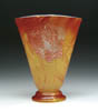 LEGRAS ENAMELED VASE. Monumental Legras vase has an enameled scene of cabin in a meadow next to woods with smoke extending from chimney, all done in shades of orange. Signed on the side “Legras”. SIZE: 14-3/4 in. t. CONDITION: Very good to excellent. 5-61095 (500-1,000)