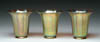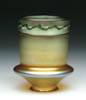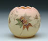 THREE MINIATURE ROSE BOWLS. Lot consists of a citron colored satin glass rose bowl with applied pink rim around crimped top. The second is a cream colored satin glass rose bowl with applied frosted pedestal foot and a tri-crimped top with enameled decoration of pink, green and blue leaves, attributed to Webb. The third is a miniature MOP satin glass rose bowl in the flower and acorn pattern with applied crystal, frosted foot. One is pictured in the “Collectible Glass Rose Bowls” by Johanna Billings fig. 90 pg. 38. Accompanying lot is an autographed copy of “Collectible Glass Rose Bowls” by Johanna Billings with Sean Billings. SIZE: All approx. 3 in. t. CONDITION: Very good to excellent. Collection of Johanna & Sean Billings 5-60948, 5-60950, 5-60963 (400-500)