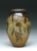 GALLE CAMEO BANJO VASE. Cameo decoration of leaves and pods in colors of brown and green on a pink and white frosted background. Signed “Galle” in cameo relief on side of vase. SIZE: 6-1/2 in. t. CONDITION: Very good to excellent. 5-60633 (700-1,000)