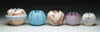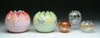 SIX SATIN GLASS ROSEBOWLS. Lot consists of six matte finish rosebowls with white interior lining and crimp top in colors of green, blue, pink and yellow. One is pictured in the “Collectible Glass Rose Bowls” by Johanna Billings fig. 4 pg. 14. SIZE: Approx. 4 in. dia. CONDITION: Very good to excellent. Collection of Johanna & Sean Billings 5-60749 (200-400)