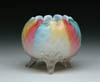 RAINBOW MOP SATIN ROSE BOWL. D.Q. pattern with three applied crystal feet, crimped top, rainbow colors of blue, pink, orange, green and yellow. SIZE: 4-1/2 in. dia. CONDITION: One of the applied feet has two chips, otherwise very good to excellent. Collection of Johanna & Sean Billings 5-60918 (500-700)