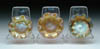 FOUR SATIN GLASS ROSE BOWLS. Lot consists of four MOP satin glass rose bowls. Two are in the herringbone pattern, one in a D.Q. pattern and one in a looping pattern. Three are pictured in the “Collectible Glass Rose Bowls” by Johanna Billings fig. 70 pg. 34, fig. 118 pg. 45 and fig. 77 pg. 35. Accompanying lot is an autographed copy of “Collectible Glass Rose Bowls” by Johanna Billings with Sean Billings. SIZE: Approx. 4 in. dia. CONDITION: Chip to the side of one rose bowl, the remaining are very good to excellent. Collection of Johanna & Sean Billings 5-60940, 5-60941, 5-60959 (600-800)