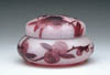 GALLE CAMEO BOX. Wonderful Galle box has maroon cameo leaves and berries against a frosted background. Box is topped with matching cameo lid with frosted background shading to green in the center. Both top and box are signed in cameo “Galle”. SIZE: 6-1/2 in. dia. CONDITION: Tiny fleabite to inside rim of lid, otherwise very good to excellent. Collection of Dr. C. & Margaret Chastain 5-61433 (1,000-1,500)