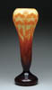 D’ARGENTAL CAMEO VASE. Extremely nice D’Argental vase has lilac and green cameo flowers, stems and leaves against a frosted background. Signed on the side with etched signature “D’Argental”. SIZE: 12-3/4 in. t. CONDITION: Very good to excellent. 5-61278 (600-800)