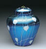 COLONIAL WARE WINE JUG. Lovely Colonial Ware wine jug is decorated with delicate blue and lavender flowers behind heavily enameled vertical gold stems and leaves topped with daisy type flowers. SIZE: 12 in. t. CONDITION: Some minor wear to gold trim and flowers at top of vase, otherwise very good. 5-60835 (1,000-1,500)