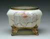FOUR ROSE BOWLS. Lot consists of a cased white miniature rose bowl with a pedestal foot, a custard egg shaped rose bowl with three applied crystal feet, a yellow cased rose bowl with three applied crystal feet and a pink and white striped rose bowl with applied crystal wishbone feet. SIZE: Range from 2-3/4 in. to 4-3/4 in. t. CONDITION: One minor flake to foot on egg shaped custard rose bowl, otherwise very good to excellent. Collection of Johanna & Sean Billings 5-60930, 5-60934, 5-60954, 5-60965 (400-600)