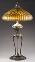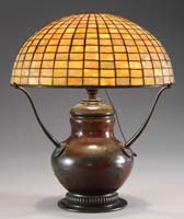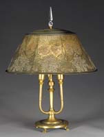 WILLIAMSON LOUIS XV TABLE LAMP. Attributed to Williamson, this fully leaded shade begins at the aperture with an amber colored Art Nouveau design that flows into medallions with colors of green, yellow, rum, butterscotch and light blue. Vertical panels of blue, butterscotch and turquoise glass used in this lamp is highly textured and gives off a very warm feeling. The design is one of the most intricate that Williamson created. The shade is supported by a three socket base that represents the epitome of the Art Nouveau period with an acorn finial, top cap and acanthus leaf decorated stem and foot. The shade and base carry nice patina finish. SIZE: Shade is 18″ dia. Overall 25″ t. CONDITION: Very good to excellent with very few if any tight hairlines. 5-68084 (11,000-15,000)