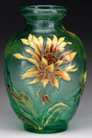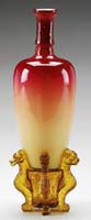 D’ARGENTAL FRENCH CAMEO VASE. Very pretty vase begins with a soft yellow background and is decorated with an all-over floral pattern in red. The red is carried down to the padded foot. Signed in cameo “D’Argental”. SIZE: 12″ h. CONDITION: Very good to excellent. 5-68412 (800-1,200)
