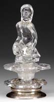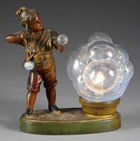 FRENCH BUBBLE BLOWER ACCENT LAMP. Adorable bubble blower holds one bubble in hand and another at the end of a wand while a glass globe depicting cluster of bubbles with iridescent finish rests next to him. Marked on the reverse “Fabrication Francaise Made in France Paris” within a circle. SIZE: 8″ t. CONDITION: Very good to excellent. 5-68016 (500-700)