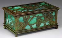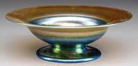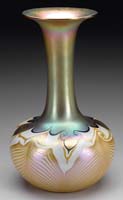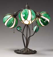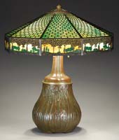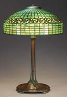 STEUBEN PULLED FEATHER BOUDOIR LAMP Attributed to Steuben, this beautiful boudoir size lamp begins with a dome shade with a green drag loop design outlined in gold against a calcite background. Shade is supported by its original base with complimentary design. Base appears to have original hardware. SIZE: 14″ t. CONDITION: Very good to excellent with rim roughness to shade that is concealed by heat cap. 5-67551 (2,500-3,500)