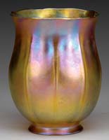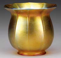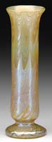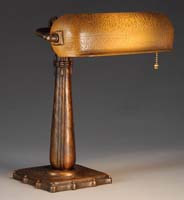 IRIDESCENT GOLD DESK LAMP. Very nice desk lamp has bell shaped gold iridescent shade showing strong flashes of pink, blue and green. The interior of the shade is bright gold iridescence with pink highlights. The shade rests atop a bronze base with saucer foot, vertically ribbed stem and three arm spider with a single socket. Shade and base are unsigned. SIZE: Shade is 8-1/4″ dia. Overall 14-1/2″ t. CONDITION: Shade is very good to excellent. Base has some minor wear and discoloration to patina. 5-68090 (2,500-3,500)