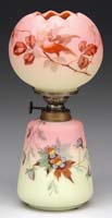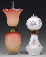 TWO MINIATURE LAMPS. 1) SI-250. White milk glass Diana with pink and tan ground paint highlighted in gold. Nutmeg burner. 2) Cranberry glass half shade and ball style base with an inverted thumbprint. Acorn burner. SIZE: 7-1/2″ t and 7″ t respectively. CONDITION: Both lamps are very good with the first lamp showing some wear to the background paint. 5-68159, 5-68185 (400-600)
