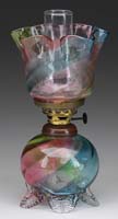 RAINBOW SWIRLED OPALINE MINI LAMP. SI-255. Opaline lamp. Heavily embossed pattern with pink, blue, yellow and green swirling. Nutmeg burner. SIZE: 8″ t. CONDITION: Very good to excellent. 5-68161 (400-600)