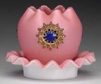 DECORATED WEBB BURMESE MINIATURE LAMP. The shade with beautiful peach-pink shading to yellow with enamel decoration including a branch with a bird. The base with peach to pink shading to yellow having an enamel decoration of flowering branches. Base is marked on the underside “Thos. Webb & Sons Queens Burmese Ware Patent”. Foreign burner. SIZE: 8-1/2″ t. CONDITION: Very good to excellent. 5-68127 (1,000-2,000)