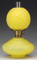 YELLOW SATIN MINIATURE LAMP. SI-389. Cased glass pansy ball shade and melon ribbed base in bright yellow. Nutmeg burner. SIZE: 7″ t. CONDITION: Very minor interior roughness on top and bottom edge of shade, otherwise very good. 5-68188 (400-600)