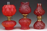 THREE RED MINIATURE LAMPS. 1) SI-Fig. III. Red satin artichoke lamp. Nutmeg burner. 2) SI-131. Red flashed clear glass with embossed beaded swirl and floral pattern. Hornet burner. 3) SI-284. Red satin glass with heavily embossed pattern. Nutmeg burner. SIZE: Range from 8″ to 8-3/4″ t. CONDITION: Very good to excellent with roughness on the top edge of the shade as well as significant wear to the read flashing on the second lamp and the shade on the third lamp is significantly darker than the base. 5-68179 (400-600)