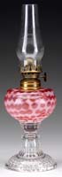 PINK MINIATURE LAMP. SI-375. Deep pink shading to light pink cased glass with embossed design. Foreign burner. SIZE: 10-1/4″ t. CONDITION: Very good to excellent with roughness to fitter rim. 5-68192 (450-650)