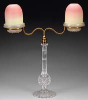 VERY RARE RAINBOW CUT GLASS MINI LAMP. SII-547. Cut glass; strawberry pattern; yellow and pink coloring. Applied silver band with four ball feet around the base of the lamp. Hinks burner with signed “Hinks” chimney. SIZE: 9-1/2″ t. CONDITION: Very good to excellent. There are two minor imperfections in the cut design on the base, also one teeny imperfection in the cut on the shade. All three are exceedingly difficult to fine in this busy cut design and are rather insignificant. Coloration superb! 5-68137 (3,500-5,500)