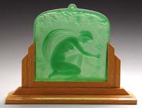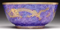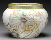 DELATTE CAMEO BOWL. Outstanding Delatte cameo bowl features underwater scene with green cameo fish and aquatic plants against a rich pink background. Cameo fish and plants are done with two colors of green; an olive green and light colored green, giving wonderful highlights to the details. Signed on the side in cameo “A. Delatte Nancy”. SIZE: 6-1/2″ t x 8″ dia. CONDITION: Very good to excellent. 5-66249 (1,500-2,500)