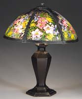 CLASSIQUE REVERSE PAINTED PANEL LAMP. Rare and beautiful intricate floral design in a multitude of colors including yellow, rouge, blue and green are set against a strong black background. Six painted panels are housed in a black painted frame which is supported by a black painted Classique two socket base in six sided form that compliments the shade. Shade is unsigned. Base is marked with the Classique emblem on the stem. SIZE: Shade is 18″ dia. Overall 22″ t. CONDITION: Very good to excellent with minor wear to exterior black paint on shade frame. 5-68254 (2,500-3,500)