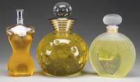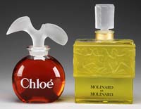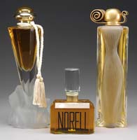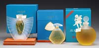 DEVEZ CAMEO ATOMIZER BASE. Soft teal blue ground is decorated with an earthen-hued sunflower design overall with butterflies. This base has an unusual 3-thumbprint feature. Signed “Devez” in cameo. SIZE: 5-1/2″ h. CONDITION: Very good to excellent. No hardware present. 5-68290 (100-300)