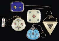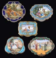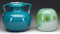 TWO MINIATURE ENAMELED VASES. 1) Classic baluster form and depicts trees with heavy green enameled foliage beside a road with pink mountains in the background on a frosted ground. Unsigned. 2) Rectangle frosted glass vase is decorated with a single large enameled tree in purples and white on a frosted ground. SIZE: 1-3/4″ and 1-1/2″ t respectively. CONDITION: Both are very good with tiny chips to rim of baluster form vase. 5-69034 (200-400)