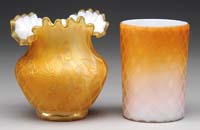 TWO MINIATURE LAMPS. 1) SII-267. Pairpoint paneled white milk glass lamp with multicolored floral decor and gold highlighting. Marked on its base “Dresden”. Acorn burner. 2) SII-534. Base is dark to light orange satin with dqmop pattern; three applied frosted feet. Shade is a color match to the base, however not the original. Foreign burner. SIZE: 8-1/2″ t and 10″ t respectively. CONDITION: Very good to excellent with wear to the gold highlighting. Shade is very good to excellent and two of the bases feet have significant damage on the second lamp. 5-68131, 5-68174 (300-500)