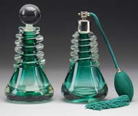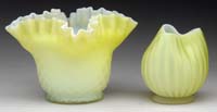 TWO GREEN MINIATURE LAMPS. 1) SI-229. Green milk glass with embossed design and flowers. Nutmeg burner. 2) SI-231. Green satin glass in the Drape pattern. Nutmeg burner. SIZE: 7-3/4″ and 8-1/2″ t respectively. CONDITION: Shade of first lamp has tight hairline extending 2″ plus. The second lamp is very good with two 1/8″ fish scale flakes on the top outside edge of shade. 5-68165-1 (300-500)