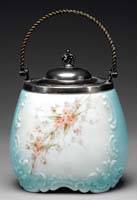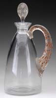 MOSER PITCHER. Padded and wheel carved golden grapes, green leaves and charcoal gray stem. The other leaves and vines are intricately wheel carved on a clear background. Pitcher is finished with a silver plated stem, spout and lid. Engraved “B178” on underside. SIZE: 8” t. CONDITION: Very good to excellent. 5-69062 (1,000-1,500)