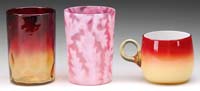THREE ART GLASS MINI LAMPS. 1) SI-588. Orange to pink ribbed swirled shade on a pink ribbed swirled base with applied crystal rigaree on the top and bottom edges. Foreign burner. 2) SII-Fig. XXVIII. Blue satin dqmop shade and font mounted on a brass base. Foreign burner. 3) SI-Fig. 5 (left). Shade is dark pink MOP with vertical ribbing. Base is SI-528 candy stripe pink and white cased glass with applied clear glass feet. Nutmeg burner. SIZE: 9-1/4″ t, 10-1/4″ t and 9-1/2″ t respectively. CONDITION: First lamp is very good to excellent. Second lamp has 1/4″ split in one of the shades ruffles; significant staining and some roughness on the fitter edge. Font and brass base are very good to excellent. Third lamp has one corner ruffle on shade being repaired and the base has four rough feet. 5-68129, 5-68141, 5-68142 (400-700)