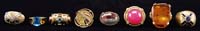 THREE MINIATURE LAMPS. 1) SI-367. Brown, red and white End of Day with straight bead and ribbed pattern. Hornet Burner. 2) HI-205. Honey colored reverse swirl lamp. Hornet burner. 3) SII-Fig. XXXII. White milk glass; yellow background with applied and multicolored leaf, acorn and bird decor. Foreign burner. SIZE: 9″ t, 8-1/4″ t and 10″ t respectively. CONDITION: Chipping on top edge of shade and a small fish scale flake at fitter edge. Base is very good. Second lamp has 1/4″ fish scale flake on top outside edge of shade and minor roughness on fitter edge. Base is very good with mfg imperfection. The third lamp has one small acorn on the base that is missing as well as some minor wear to the painted decor. Chimney is broken. 5-68123, 5-68140, 5-68156 (400-600)