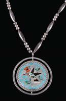 STEUBEN FIVE LIGHT INTARSIA CHANDELIER. Five light pan chandelier is complete with ceiling cap and chains. This pan fixture supports five beautiful gold aurene shades with applied intarsia borders. Each shade has an applied green rim with the applied intarsia decoration in green and white. Each shade has an overall iridescent finish of pink, magenta and purple. Each shade is signed with a Steuben fleur de lis mark. SIZE: Each shade is 5″ t x 2-1/4″ fitter. Overall 36″ t. CONDITION: Very good to excellent with all shades having chips to their fitters which are concealed when in place. Fixture has some wear to finish. 5-68250 (4,000-6,000)