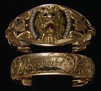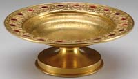QUEZAL DECORATED TABLE LAMP. Beautiful King Tut decorated mushroom shaped shade begins with a green background with an overall platinum King Tut decoration with superior highlights of purple, blue and magenta. Antique brass base is comprised of rams head decoration on three risers that is finished at bottom with hoofs resting on an Art Nouveau platform. Shade is signed “Quezal”. SIZE: Shade is fitter 6″ and is 9″ at the widest. Overall 16-1/2″ t. CONDITION: Very good to excellent. 5-68099 (5,000-7,000)