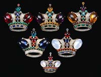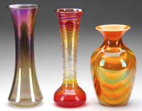 SUPERB RARE GLOSSY MELON RIBBED RAINBOW MINI LAMP. SI-Fig. V (left). Gorgeous pink, yellow and blue rainbow glossy finish miniature lamp having air-trapped melon ribs is completed with a row of applied clear glass shells around top and bottom of base. Silver plate foreign burner. SIZE: 9-3/4″ t. CONDITION: This magnificent rainbow lamp exhibits the finest color we have ever seen in a lamp of this type. Very good to excellent. 5-68135 (4,000-6,000)