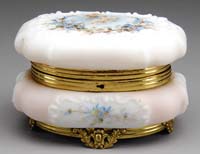 THREE WMG MINIATURE LAMPS. 1) SI-179. White milk glass with embossed beaded panels. Nutmeg burner. 2) SI-244. White milk glass “Nara” with painted decor in tan, blue and gold. Nutmeg burner. 3) SI-488. Reclining Elephant in white milk glass with gold highlighting and a SI-230 Acanthus shade with yellow background. Acorn burner. SIZE: 7″ t, 7-3/4″ t and 7″ t respectively. CONDITION: Shade’s fitter edge is badly damaged and repaired. The glass on the second lamp is very good to excellent with a fair amount of wear to the painted decor. The glass in the third lamp is very good to excellent with major wear to gold highlighting on base. 5-68149, 5-68158, 5-68175 (300-500)