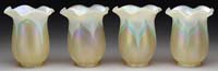 QUEZAL 4-LIGHT CEILING FIXTURE. Lamp begins with four beautiful corset shaped shades with a white pulled feather decoration with green trim on a fabulous gold ground with a rainbow iridescent finish overall. Shades are supported by a very ornate four light pan ceiling fixture with patina finish. Shades are all signed “Quezal”. SIZE: Overall 10″ l. CONDITION: All shades are very good to excellent with one shade having a ground fitter. Fixture has a small dent to side. 5-68116 (1,300-1,800)