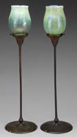 QUEZAL 10-LIGHT LILY LAMP. Lamp begins with ten nicely matched Quezal lily shades with each having a deep gold ground and superb iridescent finish of deep purple, blue and magenta. These shades are supported by a 10-light lily base that is decorated with lily pads and buds around the bottom platform with ten stems extending upwards and gently showering over to the shade holders. All shades are marked “Quezal” on the fitter and base is marked on the underside “Tiffany Studios New York”. We are told that Quezal commissioned Tiffany Studios to produce this base in the bright gold patina and with the Quezal shade mounts. SIZE: 18″ t. CONDITION: Shades are very good with one having clamshell chip. 5-69005 (20,000-25,000)
