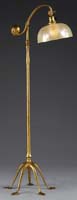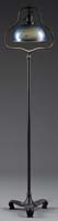 CONTEMPORARY LEADED POPPY FLOOR LAMP. Well executed contemporary dome shaped shade is decorated with an all over floral pattern of poppies in various stages of bloom. The blossoms are constructed in colors of yellow, red and orange with a multitude of striations throughout. This floral design is decorated with an abundance of foliage in various shades of green. All of this is set against a pastel background of striated glass of pinks, greens and purple. Shade is supported by a senior decorated floor base with three arms supporting six sockets that end with a shell design set above a ribbed floor stem that ends in a decorated padded platform base with four feet with patina overall and topped with a contemporary pigtail cap. SIZE: Shade is 26″ dia. Overall 79″ t. PROVENANCE: From the Estate of Geraldine Gaba, Scottsdale, AZ. CONDITION: Shade is very good to excellent. Base is very good. 5-68395 (500-1,000)