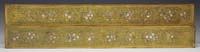 LUSTRE ART 3-LIGHT CHANDELIER. Beautiful gold pulled feather decoration on an ivory ground are the focal point of this Arts & Crafts three light chandelier. The shades are suspended from a simple three rod chandelier with original antique brass finish. Shades are signed in the fitter rim “Lustre Art”. SIZE: Overall 22″ l. CONDITION: Very good to excellent. 5-68117 (800-1,200)
