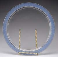 BLUE SATIN DQMOP MINI SHADE ON SILVER PLATED BASE. Light blue shading to white ribbed cased satin glass DQMOP shade with a raindrop pattern mounted on an urn-style silver plated base. Base is marked on the underside “99 EPBM 4325 E.H”. Foreign burner. SIZE: 11″ t. CONDITION: Very good with two teeny nicks on the ruffled edge of the shade and minor dents in the base. 5-68160 (300-500)