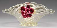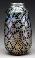 E. ROUSSEAU CRACKLE VASE. Lavender crackle glass body with internal burgundy diffuse striations. The upper rim is turquoise applied glass and the foot is deep turquoise applied glass. Unsigned with paper sticker on underside “Austin Collection 179”. SIZE: 5-3/4” t. CONDITION: Very good to excellent. 5-69077 (2,000-3,000)