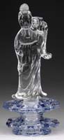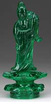 CONTEMPORARY FIGURAL LAMP. Lovely figural lamp has cast bronze base of lovely woman in flowing gown standing with a flower stem wrapping around her body to her hands. Each of the two flower blossoms is set with a green pulled feather lily shade with gold iridescent interior. The foot of the bronze is impressed with artist’s signature “Augusto Moreau”. Lamp base has a cloth-covered underside with a label “Renaissance Art Products”. SIZE: 27-1/2″ t. CONDITION: Very good to excellent. 5-67550 (300-500)