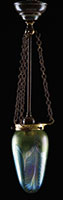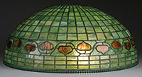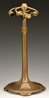 Loetz desk lamp has dome shaped shade with blue iridescent wavy lines around the bottom giving way to a platinum iridescent all over oil spot decoration with strong green, purple, and blue highlights. Shade is supported by a bronze adjustable desk clamp with two arm socket cluster. The base has a decorated foot and is finished in a rich brown patina with heavy green highlights. Shade is held in place by a matching bronze floral open work heat cap with acorn finial. Base is unsigned. SIZE: 18-3/4″ t. CONDITION: Shade and base are very good to excellent. Base is rewired with appropriate cloth cord. 5-69223 (3,000-5,000) – Lot 2014