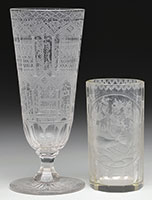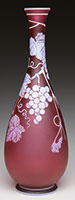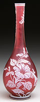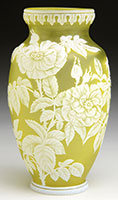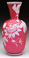 Early vase attributed to Baccarat has cameo floral decoration of green leaves and shaded pink flowers surrounding the entire vase. Cameo decoration is set against a soft white background. Vase is finished with a gilded lip and polished foot. Unsigned. Vase is accompanied by copies of pages from the book One Hundred Types of Collectible Glass, Book II. One page shows a similar example of this vase while another page has a description that reads, “A generation or more before French cameo hit full stride, Baccarat made this vase about 1850.” SIZE: 11″ t. PROVENANCE: James Boma Collection. CONDITION: There is a tiny open bubble in two of the pink flowers (from the making.) There is also wear to the gilded rim and the gilding may have been redone at some point, otherwise very good to excellent. 5-69651 (700-1,000) – Lot 3397