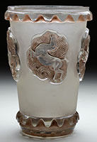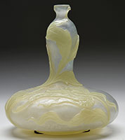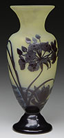 Large D’Argental vase has brown cameo decoration of grapevines, leaves and clusters surrounding the entire vase all set against a background of brown shading to amber. Signed on the side in cameo “D’Argental” with the cross of Lorraine. SIZE: 14″ t. PROVENANCE: Private New England Collection. CONDITION: Very good to excellent. 5-69252 (2,000-3,000) – Lot 3390