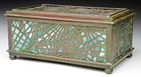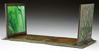 Bronze desk set has a cameo glass figural lamp showing a male lion with front feet on a rock with a tree trunk riser behind him leading to a bronze textured shade ring. Lion and riser are supported by a green onyx platform. Domed shade has a green cameo glass design of a camel caravan coming upon a river with other camels, donkeys and Arabs at waters edge. Shade is further decorated with green cameo palm trees and clouds in the sky all set against a salmon colored background. Base and shade are unsigned. Lamp is accompanied by a matching pen tray with green onyx oval platform and 2 bronze lions, male and female. Pen tray is finished with a bronze inkwell at each end. Each inkwell is impressed with holly,leaves and berries encircling the body and lid of each inkwell. The inkwells are complete with their original glass inserts. Set also includes a paperweight with a bronze female lion on a green onyx platform. All pieces are unsigned. SIZE: Shade 11-1/8″ dia. Lamp 23-1/4″ t. Pen try 20″ l x 10″ d x 6-1/2″ t. Paperweight 6-1/4″ l x 3-1/2″ d x 4-1/4″ t. CONDITION: All are very good to excellent. Shade has a shallow flake across the bottom of the rim, otherwise very good. 5-69507 (3,000-5,000) – Lot 3389