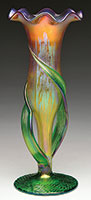 Loetz flower form vase has central flower form bud in the Medici pattern with platinum iridescence against an orange lightly iridescent background. The flower form is held by two green swirling lightly iridescent leaves extending from a textured green inverted saucer foot. Unsigned. SIZE: 11′ t. CONDITION: Very good to excellent. 5-69215 (3,500-4,500) – Lot 2011