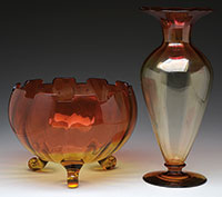 1) Daum internally decorated vase has mottled colors of blue,orange and amber all shading from dark at the foot to lighter at the lip. Vase is finished with two applied amber glass handles. Signed on the side with polished signature “Daum Nancy” with the cross of Lorraine. 2) Schneider trumpet vase has turquoise blue cameo leaves at the bottom of the vase which give way to vertically carved ribs extending halfway up the vase which gives way to internally decorated mottled purple. Vase is further decorated with lightly etched stylized leaves on the upper half. Signed on the clear glass inverted saucer foot with the Schneider candy cane. SIZE: 1) 8-3/4″ t. 2) 11-1/2″ t. PROVENANCE: James Boma Collection. CONDITION: Both are very good to excellent. 5-69621, 5-69693 (300-500) – Lot 3400